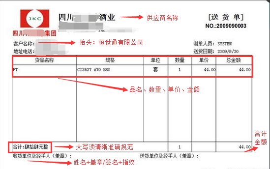 • 4、单据上供应商名称须跟所盖章上供应商名称一致,如果不一致可以有差异但不能有冲突,例如:单据上名称为广州A公司,而单据上所盖章名称为深圳A公司,那么这样就不符合要求;若是单据上供应商名称为广州A公司,所盖章上供应商名称为A公司,那么这样是符合要求的;