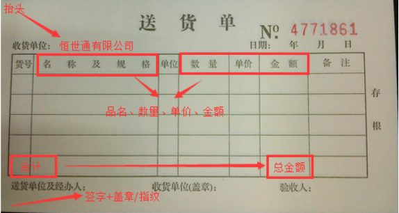 • 2、提供单据可以没有供应商抬头,单据必须要有内容“品名、数量、单价、金额”,品名不能只写款号,写款号后需要备注一下产品类别并签名和盖章,签名要签全名且能识别,如发生运费的,运费内容可体现在单据上,也可以单独提供对应的运单;