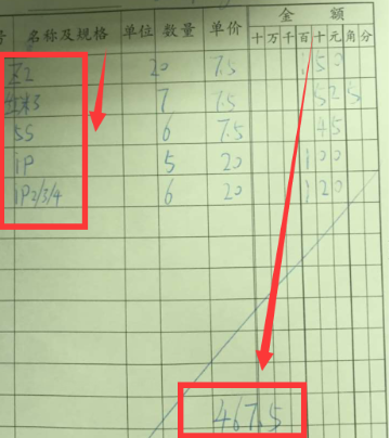 如图9所示,名称及规格一栏,填写信息不清晰,且合计金额时,为方便一笔带过,不按照对应金额项填写。
